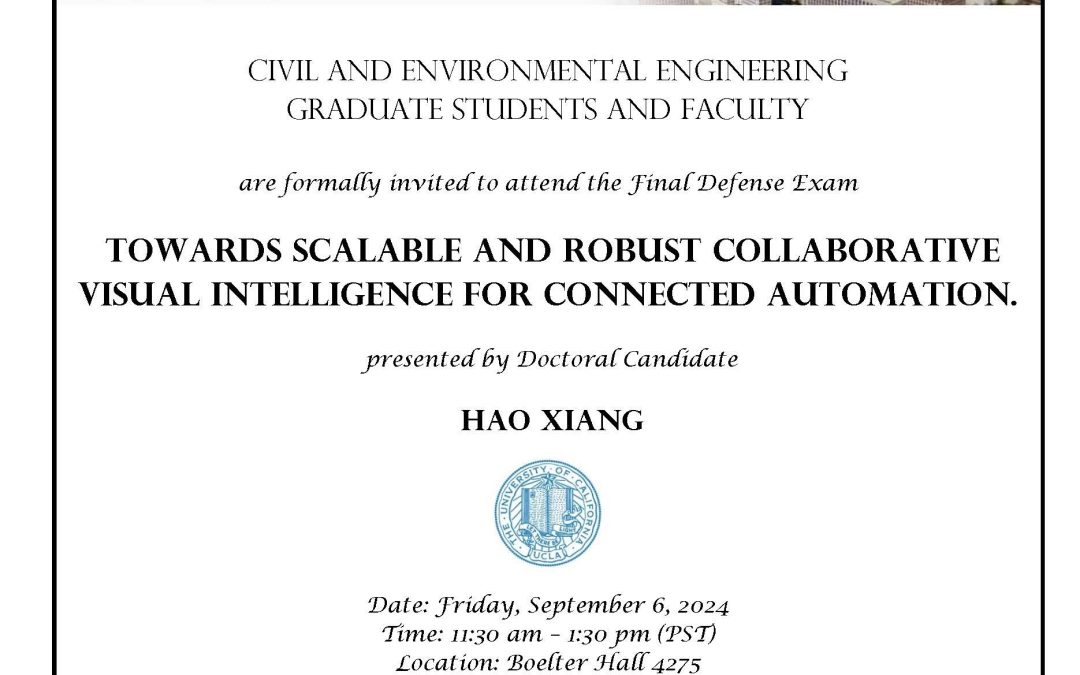 Civil and Environmental Engineering Graduate students and faculty are formally invited to attend the Final Defense Exam Towards scalable and robust collaborative visual intelligence for connected automation presented by Doctoral Candidate Hao Xiang.